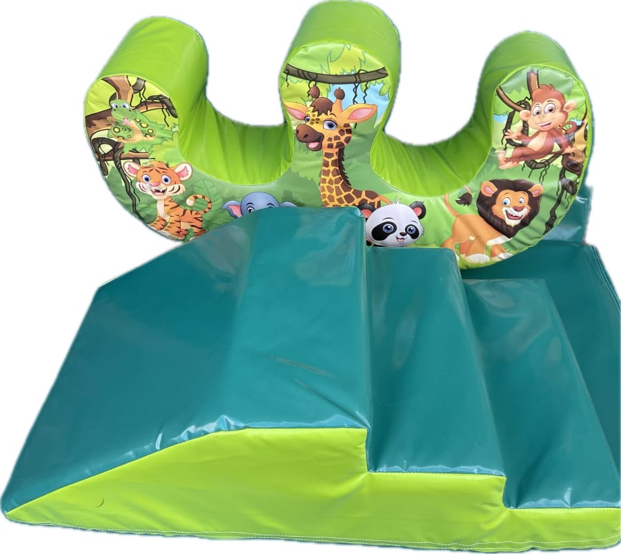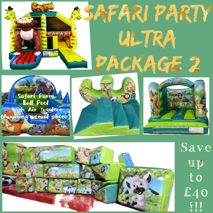 With the Safari Party Ultra Package 2, you'll get the Safari Party Bounce & Slide, Safari Party Low Height Bouncy Castle, Safari Party Ball Pool with Air Juggler, Safari Party Soft Play Set, and Safari Party Soft Play Step & Rocker. 🎉🎈🎊